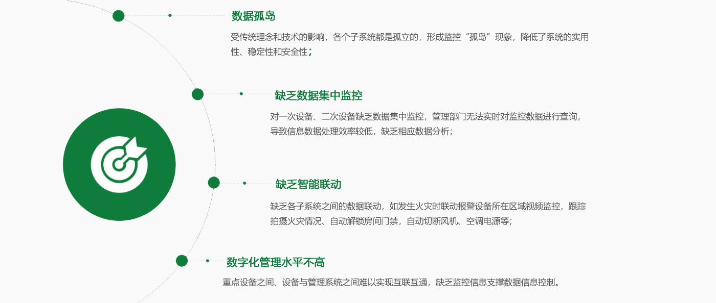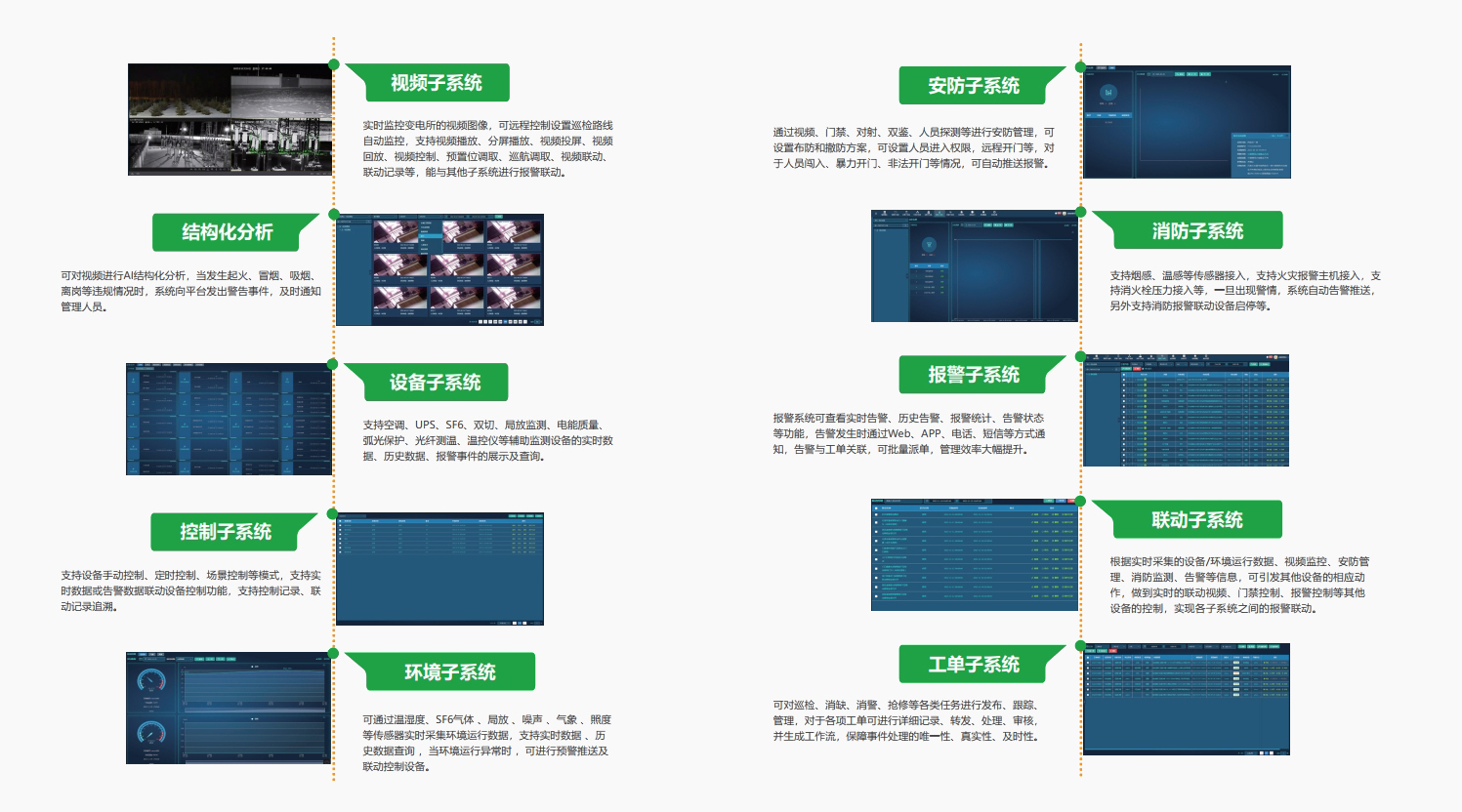 鐵路變電所輔助監(jiān)控系統(tǒng)包含視頻、設(shè)備、環(huán)境、安防、消防、報(bào)警、聯(lián)動(dòng)、工單子系統(tǒng),系統(tǒng)基于新一代人工智能、大數(shù)據(jù)分析技術(shù)、視頻結(jié)構(gòu)化分析技術(shù)等,對(duì)全站所主要電氣設(shè)備、關(guān)鍵設(shè)備安裝地點(diǎn)以及周?chē)h(huán)境進(jìn)行全天候狀態(tài)監(jiān)視和智能控制,控制環(huán)境、視頻、安防、消防、設(shè)備、工單等輔助子系統(tǒng)進(jìn)行集成,由監(jiān)控后臺(tái)完成整個(gè)系統(tǒng)的全面監(jiān)控,實(shí)現(xiàn)信息共享、告警聯(lián)動(dòng)等功能。
