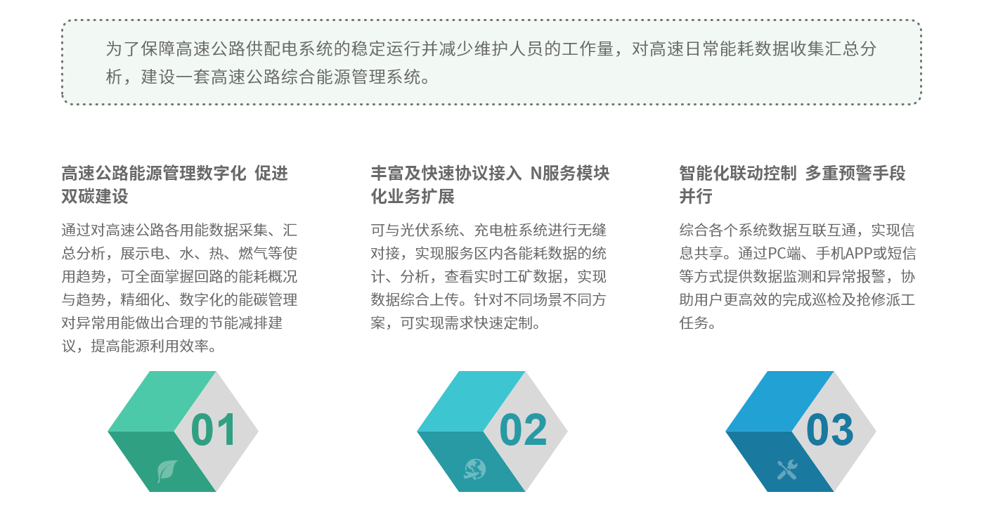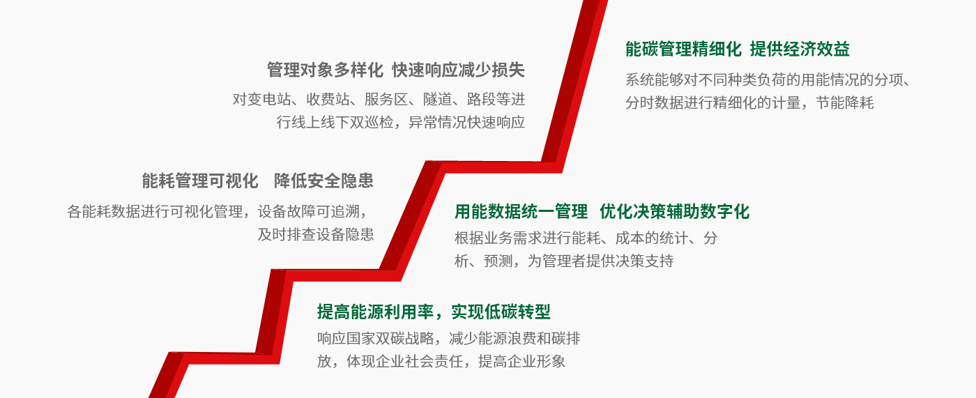 高速公路隧道、收費站、服務區的日常運營能耗的監測管理既是實現“碳達峰、碳中和”的重點工作,也是企業實現綠色低碳發展的迫切需要,同時通過能耗在線監測,可有效發現“滴冒跑漏”,節能降耗,有利于企業降本增效。