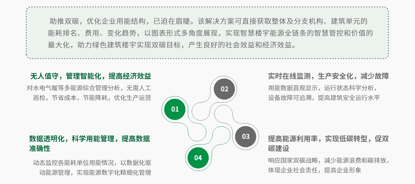 建筑能耗是繼工業能耗、交通能耗之后的第三大社會能源消耗主體,隨著城市化進程及經濟發展的加快,建筑能耗總量呈持續增長態勢。目前公共建筑在管理、用能、運行安全等諸多方面,如何做到科學管理、科學用能、節能減排、安全隱患預警是公共建筑面臨的一大難題,也加劇了碳達峰、碳中和的壓力。邊緣節點+網關+云端的創新應用將是解決問題的重要的發展方向。