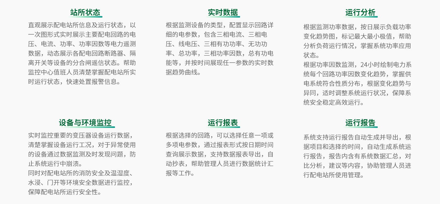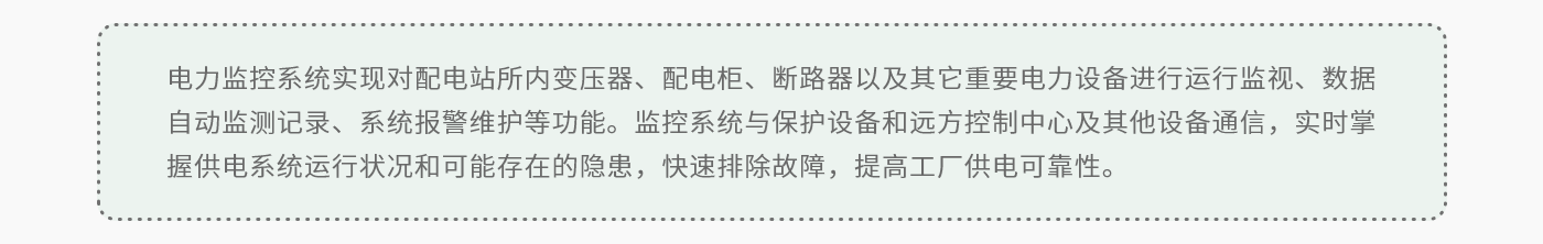 電力監控系統實現對配電站所內變壓器、配電柜、斷路器以及其它重要電力設備進行運行監視、數據自動監測記錄、系統報警維護等功能。